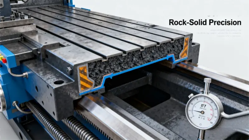 مبني على قاعدة من الحديد الزهر المقوى مع مسارات توجيهية مُقوّاة. هذا يضمن أداءً ثابتًا، مع الحفاظ على دقة بمستوى IT7 حتى في أشد الأحمال.